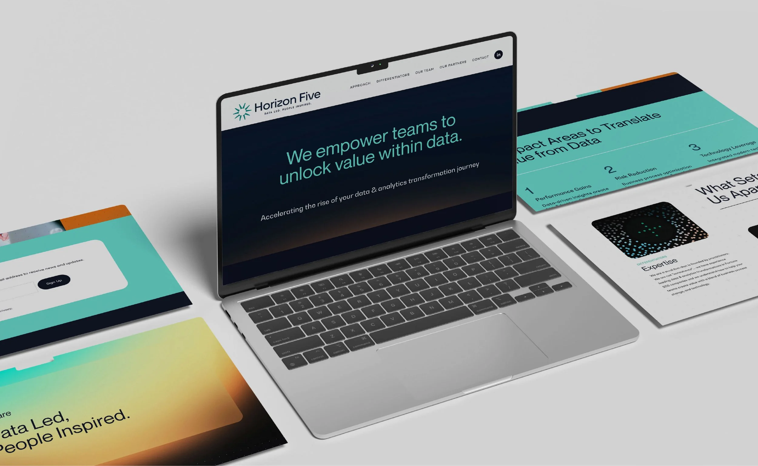 With vast expertise in the world of AI and its many applications, we developed a comprehensive identity system for Horizon 5 and a flexible website design that not only inspires confidence and curiosity but also integrates branding, web, and digital creative services.